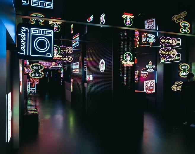 이 공간은 조명부터 음향까지 신경을 정말 많이 썼다는 게 물씬 느껴진다. 방문객이 한껏 몰입할 수 있도록 시각적, 청각적으로 세심하게 연출한 게 인상적이다. 시선을 끄는 네온사인 조명 아래를 걷다 보면 셀피를 찍고 싶은 마음이 절로 들 거다.