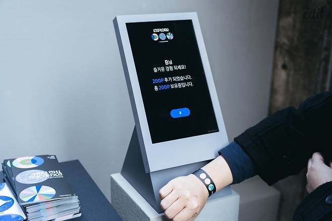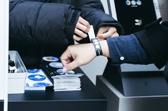 베이직 스튜디오에 마련된 갤럭시 스튜디오에 입장하면 NFC 팔찌를 하나 받는다. 이 팔찌는 일종의 여행 티켓이다. 오늘 여행의 중요한 아이템이 될 예정이다. NFC 팔찌를 차고 갤럭시 스튜디오 성수를 탐험하며 포인트를 쌓을 수 있다.