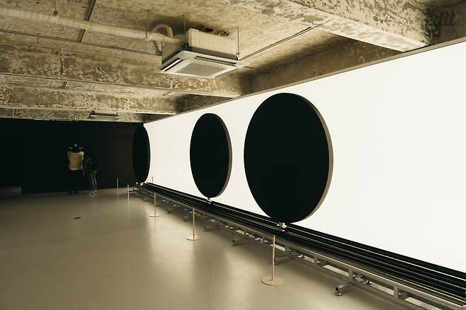 움직이는 세 개의 검은 원판으로 개기 일식을 만남에 비유한 정성윤 작가의 <Eclipse>가 전시되어 있다.