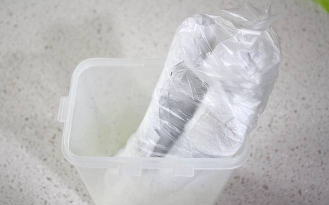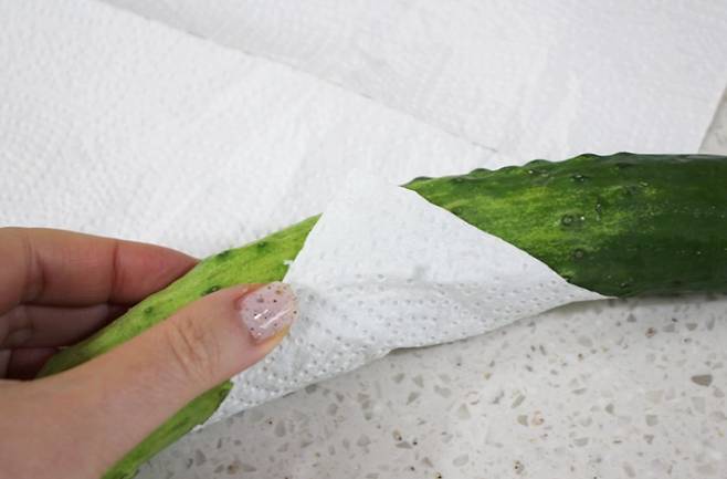 나머지는 오이의 수분이 날아가지 않도록 신문지나 키친타월 또는 랩으로 감싼 후 지퍼백이나 밀폐용기에 담아놓습니다.