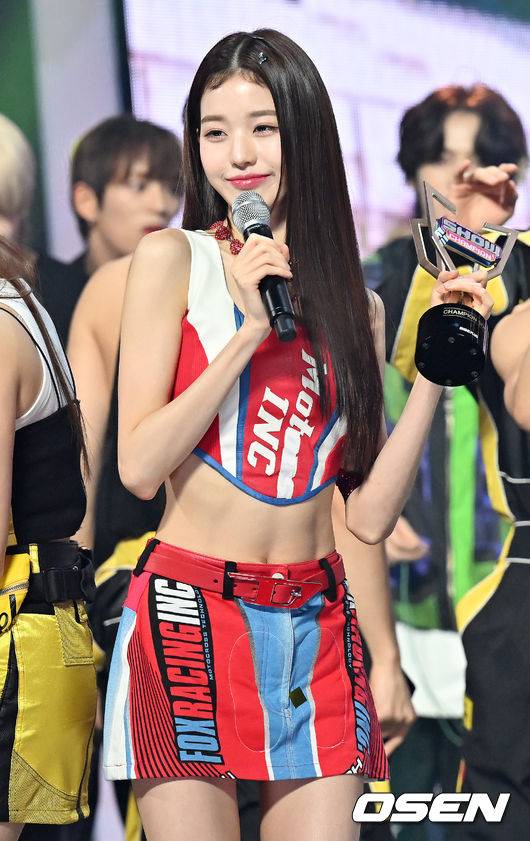 가수 아이브(IVE) 챔피언 송에 선정된 후 앵콜곡을 부르며 장원영과 가을이 트로피를 들고 인사를 하고 있다. 2022.09.07 / rumi@osen.co.kr