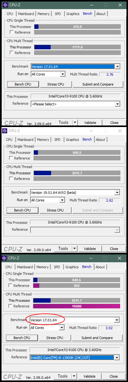 이해를 돕기 위해 회사 PC로 간단히 자료를 만들어봤습니다. 제일 위 이미지를 보시면 17.01.64 버전으로 싱글코어 470점이 나왔습니다. 중간에 19.01.64 AVX2 버전으로는 640.5점이 나옵니다. 무려 40%가 늘었습니다. 그리고 3번 이미지를 보시면? 17.01.64 버전으로 다시 돌아왔기 때문에 470점이 나와야 정상이지만 여전히 640.5점입니다. 제가 점수가 (더 낮은 점수로)바뀌지 않도록 조작한 겁니다.