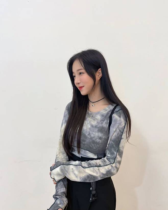 두 번째 룩에서는 그레이 톤의 타이다이 패턴 상의를 선택해 트렌디한 감각을 보여주고 있다. 블랙 초커 목걸이가 포인트 아이템으로 작용하며, 전체적으로 모던하면서도 개성 있는 스타일을 완성하고 있다.