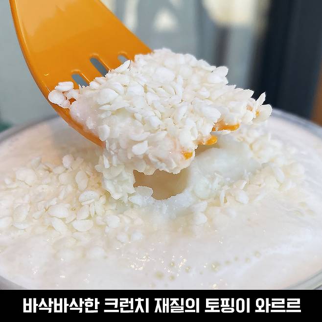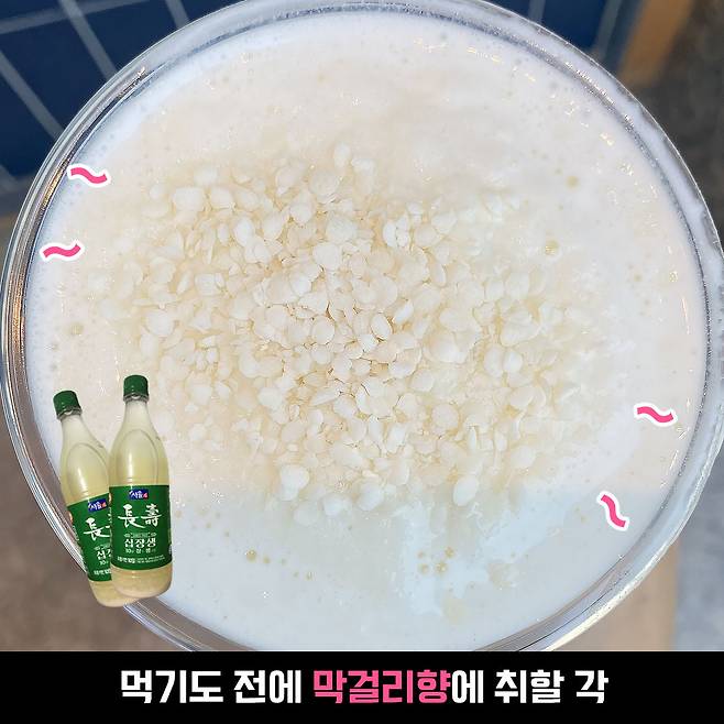 백투 막걸리쉐이크! 상단에 쌀알 알갱이들을 포크로 슥 떠봤는데요. 이거 갱장히 바삭바삭한 크런치 재질이에요. 오독오독 씹는 재미가 있었네요. 한잔 들이키니 막걸리 맛 자체보다는 막걸리 향이 너무 강해서 향에 취하는 기분이 드는 거 있죠.
