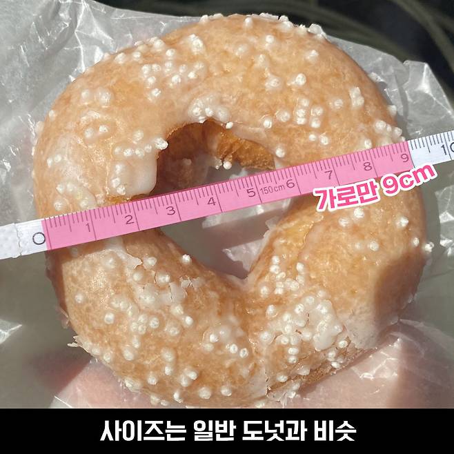 도넛 사이즈는 일반 던킨 도넛과 비슷한 정도였어요. 자로 재보니 가로만 9cm. 밥심 개인적으로는 순삭 가능한 크기였네요. 호호.