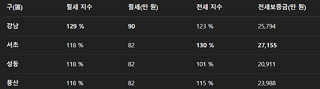 부동산 정보 플랫폼 ‘다방’에 따르면 3월 보증금 1000만원 기준 서울 평균 월세는 70만원, 평균 전세보증금은 367만원(1.8%) 오른 2억902만원으로 집계됐어요. 자치구별로 보면 평균 월세는 강남구가 전체 평균보다 20만원 높은 90만원으로 가장 비싸요. 서초구∙성동구∙용산구 118%(82만원) 등 금천구∙중랑구 111%(77만원), 마포구 105%(73만원) 등 총 10개 지역의 평균 월세가 서울 평균보다 높게 나타났어요.