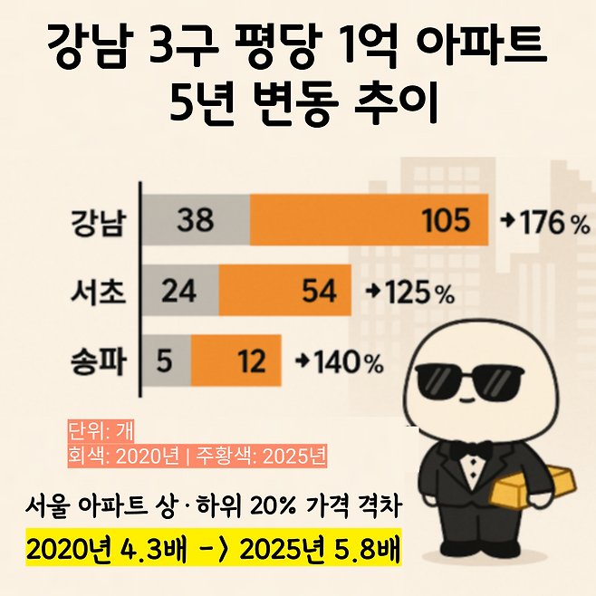 국토부 매매 실거래 자료에 따르면, 평당 1억 넘긴 단지는 2020년 67곳 → 2025년(4월) 171곳으로 나타났어요. 문 정부 5년간 부동산 대책이 28번·15억 초과 대출 금지 등이 발표됐지만, 효과는커녕 ‘비쌀수록 더 오른다’는 학습효과만 남겼죠.