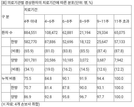 한방 경상환자의 평균 치료일수는 10.6일로 양방(5.4일) 대비 약 2배에 달했다.
