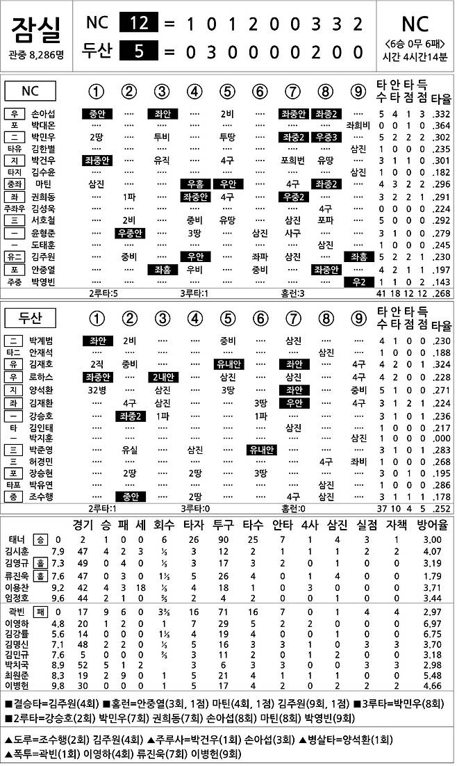 [2023 KBO리그 기록실] NC vs 두산 (8월 20일)