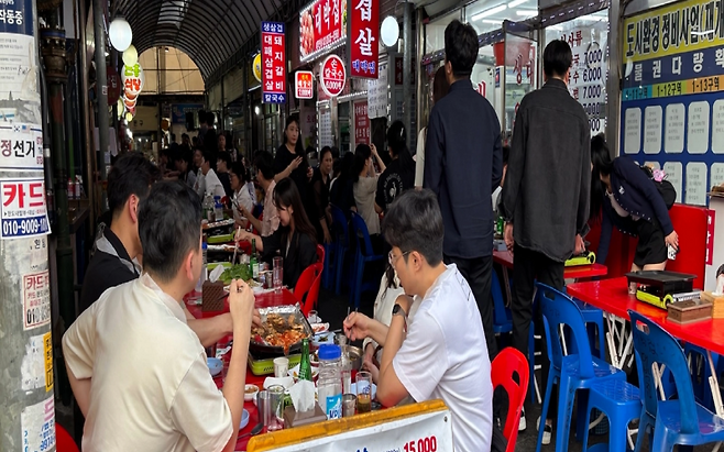 금요일 오후 7시, 영등포시장 야장 거리. 이미 테이블은 꽉 찼다. 양복을 입은 직장인부터 학생, 가족 단위까지 다양한 연령층이 좁은 골목의 플라스틱 테이블을 빙 둘러앉아 고기를 굽는다. 삼겹살이 지글지글 익으며 풍기는 고소한 냄새가 시장을 가득 메운다.
