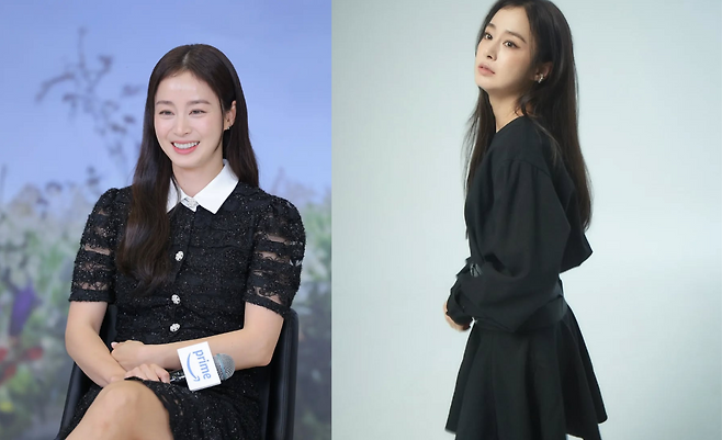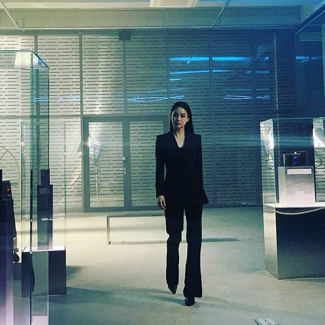 두 번째 사진에서 배우 김태희는 어두운 조명과 현대적인 인테리어가 어우러진 공간에서 블랙 수트를 연출하고 있다. 테일러드 재킷과 와이드 팬츠로 구성된 이 룩은 강인하면서도 세련된 이미지를 강조하며, 미니멀한 액세서리와 자연스러운 헤어스타일로 도시적인 카리스마를 완성했다