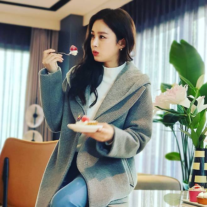 첫 번째 사진에서는 김태희가 회색 롱 코트와 화이트 이너를 매치해 편안하면서도 세련된 데일리룩을 보여준다. 자연스럽게 흐르는 웨이브 헤어와 함께 디저트를 즐기는 모습이 친근하면서도 스타일리시한 매력을 부각시킨다