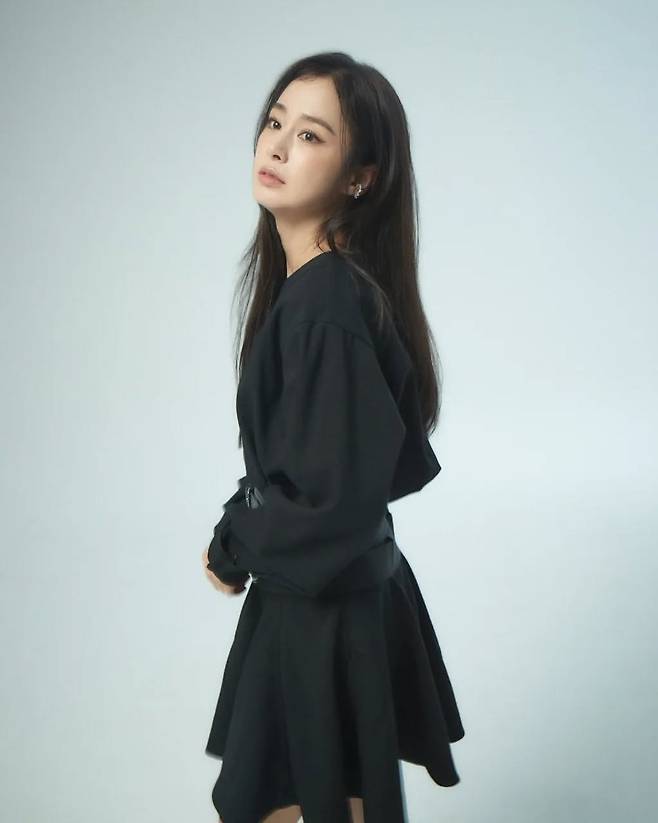 네 번째 사진에서는 김태희가 심플하면서도 우아한 블랙 원피스를 착용했다. 허리 라인을 강조한 디자인과 자연스럽게 흐르는 스커트 실루엣이 조화를 이루며, 긴 생머리와 내추럴 메이크업이 청순한 분위기를 더한다. 전체적으로 절제된 멋이 돋보인다
