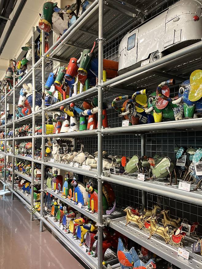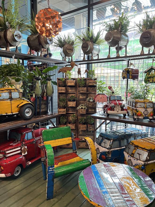 카페 내부 곳곳에서 발견되는 업사이클링 소재들이, 마치 예술 작품처럼 배치돼 있어요. 철제 드럼통, 낡은 목재, 톱니바퀴 등 산업용 소재가 살아 있는 가운데, 벽 한쪽이나 천장에 걸린 식물들과 초록색 화분들이 함께 어우러져 눈길을 사로잡죠. 금속의 차가움과 식물의 싱그러움이 대비를 이루며 색다른 감성을 만들어내요.