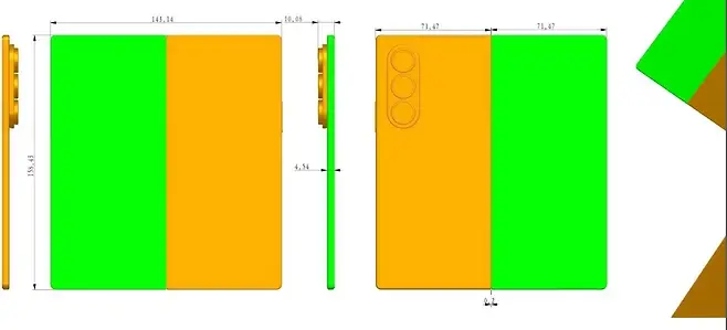 셈모바일에 따르면 가장 유력한 CAD 파일을 확보 했으며, 펼쳤을 때 4.54mm두께를 자기고 있으며, 접었을 때는 9mm 두께로라고 합니다.