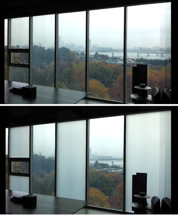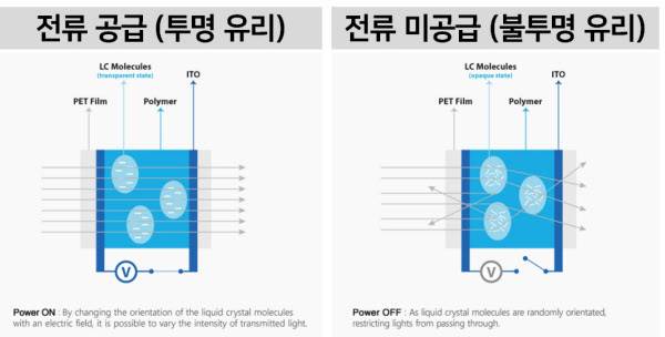 대체 원리가 뭘까. 특수하게 제작한 고분자 분산형 액정 판인 PDLC(Ploymer Dispersed Liquid Crystal)를 유리에 결합해 활용하는 것이다. 이 PDLC 필름이 삽입된 유리에 전류가 흐르면 액정 분자들이 규칙적으로 배열되면서 빛이 직진해 유리판이 투명해진다. 반면 전류가 흐르지 않을 때는 액정 분자가 혼재돼 빛이 통과하는 길이 일정하지 않기 때문에, 유리가 불투명하게 보이게 된다.