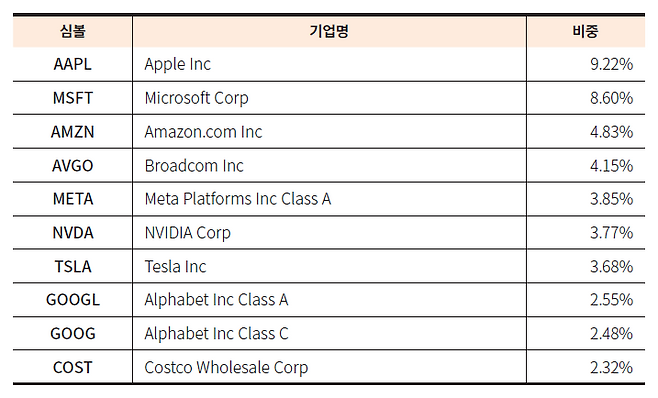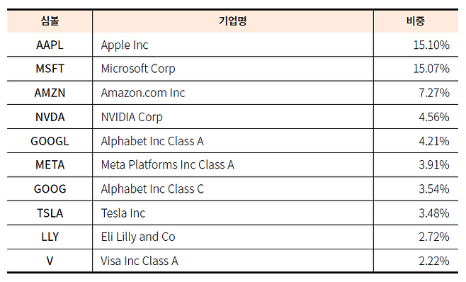 나스닥 증시에 상장되어 있는 최고의 기업 100개로 구성된 나스닥100지수를 추종합니다. 금융과 에너지 섹터가 포함되지 않은 것이 특징으로 기술주와 바이오주의 비중이 상대적으로 큽니다.