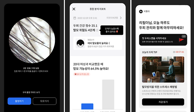 정 대표는 탈모 시장을 관리와 뷰티 시장으로 정의했다. 피부관리나 다이어트처럼 꾸준한 관리로 두피의 노화를 늦추고, 탈모 개선에 도움을 주는 솔루션을 개발하기로 했다. 관건은 동기부여 장치를 마련하는 것. 아무리 좋은 관리 제품이 있어도 소비자가 효능을 느끼지 못하면 시장에서 외면당할 수밖에 없다. 관리로 인한 변화를 직관적으로 알려줄 매개가 필요했다. 두피 상태를 진단하고 컨설팅, 실천까지 포괄하는 컨시어지 서비스 ‘리필드’의 탄생 배경이다.