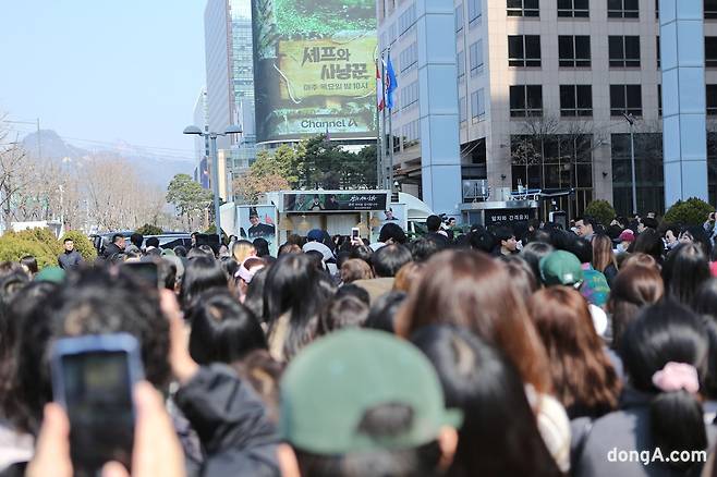 이벤트 시작 전부터 광장은 사람들로 북적였다. 점심시간을 맞아 구경 나온 직장인들부터 장항준 감독을 보기 위해 일부러 찾은 팬들까지 발걸음이 이어졌다.