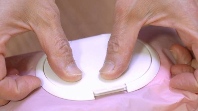 그럴 땐 먼저 다 쓴 물티슈를 준비하세요. 그리고 물티슈캡 안에 비닐을 칼로 오려 주세요.