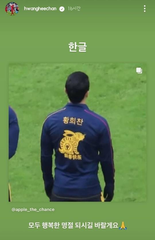 황희찬은 자신의 SNS에도 이 사진을 올려놓은 뒤 '한글'이라고 써놨다. 그러면서 팬들에게는 "모두 행복한 명절 되시길 바란다"는 설날 인사도 올렸다.