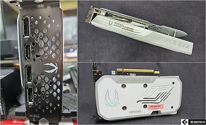 ZOTAC GAMING 지포스 RTX 4060 TWIN Edge OC White 제품의 화이트 컬러 디자인은 일부 요소를 제외하면 쿨링 솔루션부터 팬, 백플레이트까지 거의 모든 부분을 화이트 컬러를 베이스 삼아 디자인 되어 있기 때문에, 만약 화이트 컬러 기반의 PC를 꾸미려 한다면, 통일감 있는 구성을 하기 매우 매력적인 그래픽카드로 생각된다.