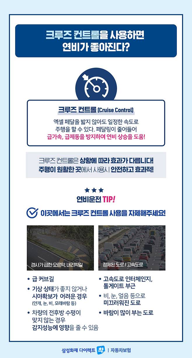 특히 경사가 있는 길에서는 자동차 속도를 유지하려는 크루즈 컨트롤 기능으로 오히려 연비가 나빠지게 됩니다. 그 외에도 사고 발생할 위험이 높기 때문에 사용하지 않는 상황이 있는데요.
