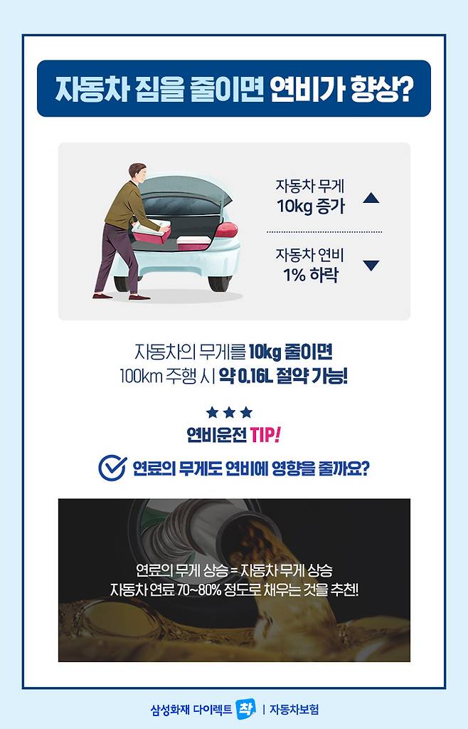 자동차에 10kg의 짐이 실리면 자동차 연비가 1%가 하락하게 됩니다.