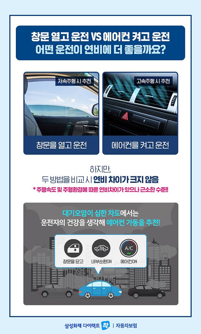 실제로 같은 조건으로 실험을 한 결과 저속으로 운전하고 있을 땐 자동차의 창문을 여는 것이 좋으며 고속으로 운전할 때에는 에어컨으로 운전하는 것이 좋다는 결과가 나왔습니다.