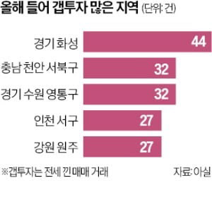 지난 11일 부동산 빅데이터 업체 아실에 따르면 지난 1월 이후 이날까지 전국에서 아파트 갭투자가 가장 많이 이뤄진 지역은 경기 화성시로 집계됐다. 최근 3개월 내간 전국 시군구 기준으로 갭투자가 가장 많았던 지역은 동탄신도시를 품은 화성시로 지난해 12월 이후 갭투자가 72건에 달했다. 화성 거래의 절반 이상은 동탄신도시에서 나왔다. 최근 3개월간 반송동과 석우동, 능동 등 동탄1신도시와 영천동, 목동, 오산동 등 동탄2신도시에서 이뤄진 갭투자는 46건이었다. 전체 1230건의 거래 중 3.6%를 차지했다. 충남 천안 서북구와 경기 수원 영통구가 각각 32건으로 뒤를 이었다.