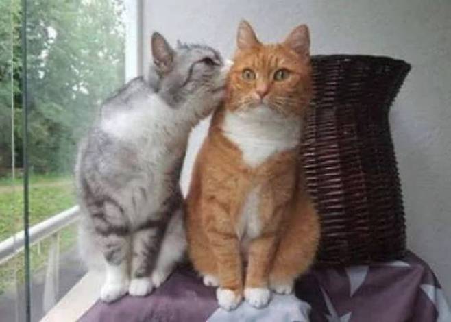 사연은 이렇습니다. 해외 온라인 커뮤니티에는 썸녀 고양이가 방심한 틈을 노려서 볼 뽀뽀를 시도하는 썸남 고양이와 이에 대한 썸녀 고양이의 반응이 담긴 사진이 올라온 것.
