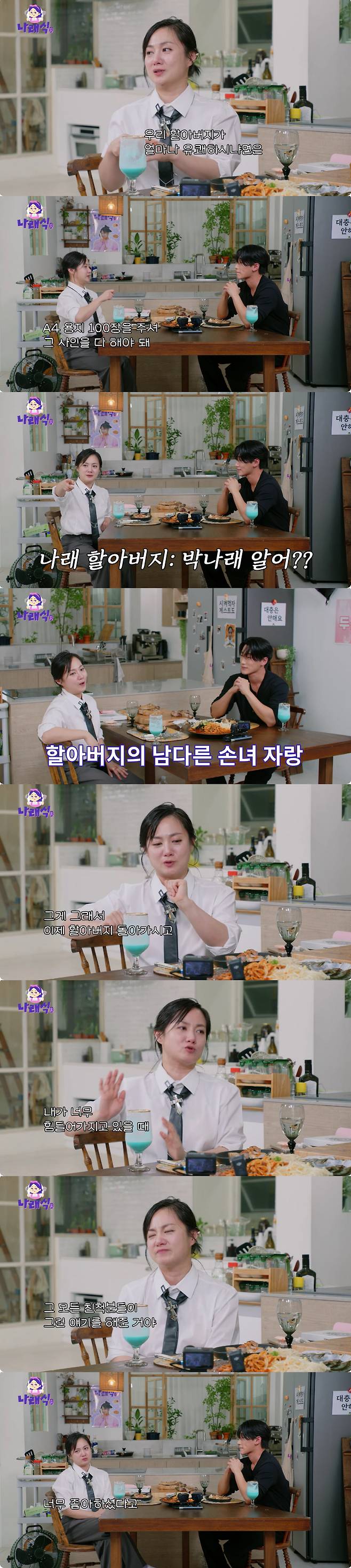 이어 돌아가신 할아버지에 대한 에피소드를 털어놨다. 박나래는 "우리 할아버지는 정말 유쾌하셨다. 가끔 내려가면 A4 용지 100장을 주시고 사인을 하라 한다. 근데 요청한 사람 이름은 없다. 그 사인을 우리 할아버지가 들고 다니면서 아무나 만나면 '박나래 알아?'라고 이름을 대신 써주고 사인을 주셨다. 치과, 농협, 우체국에 다 드리더라"라면서 "제가 할아버지 돌아가시고 너무 힘들어하니까 친척 분들이 '너무 좋아하셨다. 너무 큰 효도였다'고 말해주셨다"고 이야기 했다.