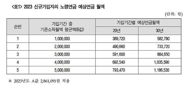 월 평균 소득 400만원의 국민연금 신규 가입자가 앞으로 30년 보험료를 낼 경우 은퇴 후 매월 100만원이 넘는 연금을 받는 것으로 나타났다.