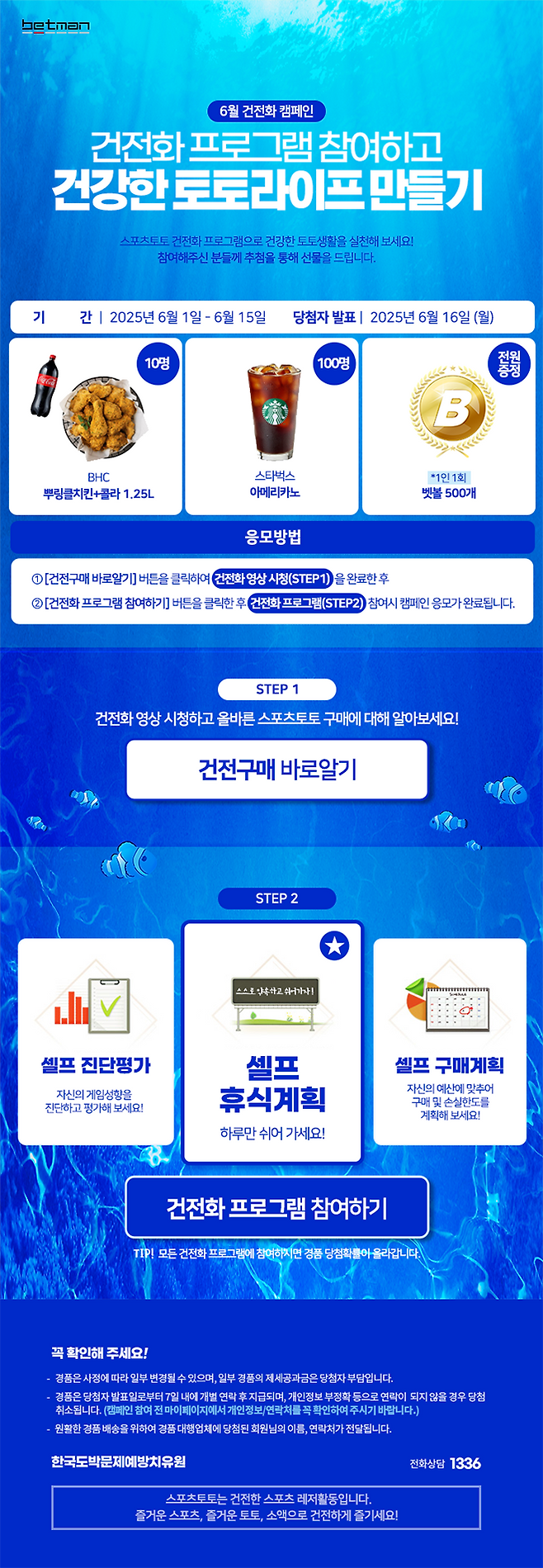 국민체육진흥공단이 발행하는 체육진흥투표권 스포츠토토의 공식 인터넷 발매사이트 '베트맨'이 2025년 6월 건전화 캠페인인 '건전화 프로그램 참여하고 건강한 토토라이프 만들기' 이벤트를 오는 15일(일)까지 진행한다.