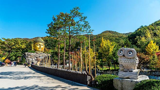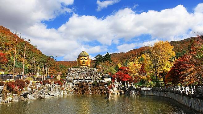 붉고 금빛으로 물든 단풍은 거대한 불두상과 와불을 감싸며, 그 풍경만으로도 고요한 위로를 건넨다.
