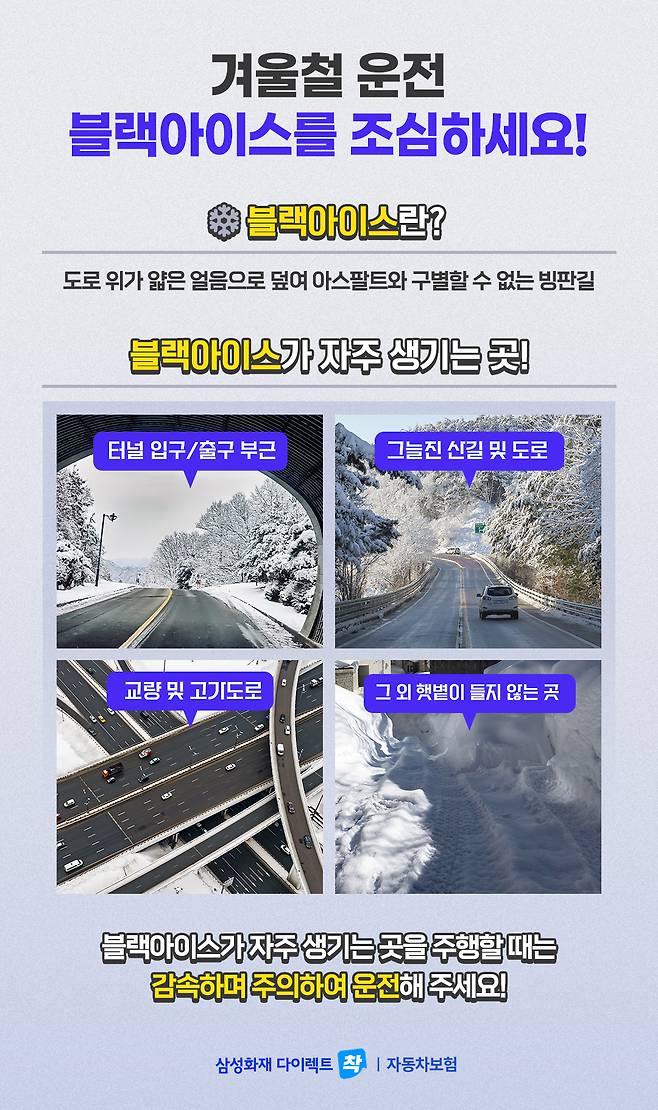 겨울철에는 눈길과 빙판길뿐만 아니라 블랙아이스도 조심해야 합니다! 블랙아이스는 도로 위가 얇은 얼음으로 덮여 아스팔트와 구별할 수 없는 빙판길을 의미하는 데요. 언뜻 보면 그냥 젖어있는 도로로 착각하기 쉽습니다.