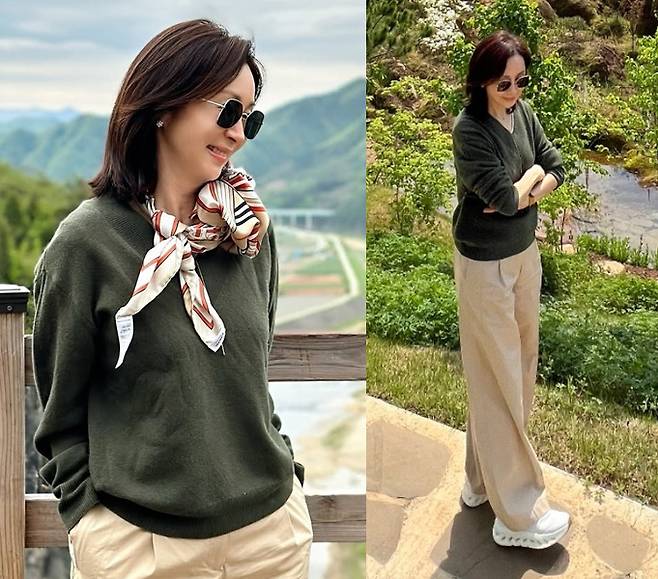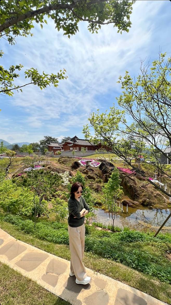 전인화가 봄 햇살 가득한 자연 속에서 여유로운 스타일을 뽐냈습니다.