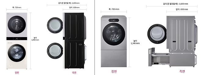 두 번째는 공간 활용에 좋아요. 생각보다 워시 타워 설치하려고 기사님이 오셨다가 설치 못하는 경우가 꽤 많아요. 기존 세트형 제품은 높이가 있어서 세탁실이 협소하면 설치가 어렵죠. 워시 타워 제일 큰 모델과 세탁건조기 시그니처 크기를 비교해보면 폭은 700mm로 똑같은데 높이는 시그니처가 550mm 낮아요. 또, 이사하게 된다면 기존에는 세탁기와 건조기를 따로 분리해야 하는데 세탁건조기는 그럴 필요 없어 번거로움이 덜 하죠.