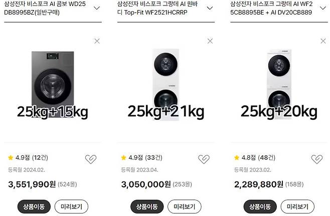 색상도 많이 없어서 아쉬운데 삼성에서 베이지 색상으로 출시를 준비하고 있어서 색상은 계속 추가될 것 같네요. 아, 건조기 용량도 15kg에서 더 커지면 좋겠어요.
