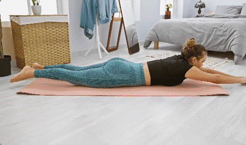바닥에 엎드린 상태에서 시작합니다. 다리는 곧게 펴고, 양팔은 머리 위로 쭉 뻗습니다. 양팔과 다리를 동시에 바닥에서 들어 올립니다. 팔, 다리, 가슴이 공중에 뜨는 상태로 자세를 유지하며 버팁니다. 몇 초간 버틴 후, 시작 자세로 돌아갑니다.