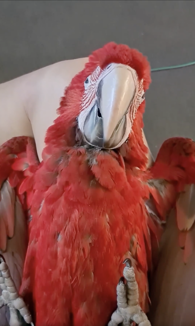 또한 주인이 앵무새의 발을 살짝 만져주었을 때, 앵무새는 눈을 살짝 떴다가 다시 감으며 만족스러운 표정을 지어 보였습니다. 이는 앵무새가 주인과의 교감에서 얼마나 큰 편안함을 느끼는지를 보여주는 장면이었습니다. 앵무새는 일반적으로 긴장 상태에서는 발을 움켜쥐는 습성을 보이지만, 이 앵무새는 주인의 손길을 완전히 신뢰하며 몸을 맡기는 모습이 매우 인상적이었습니다.