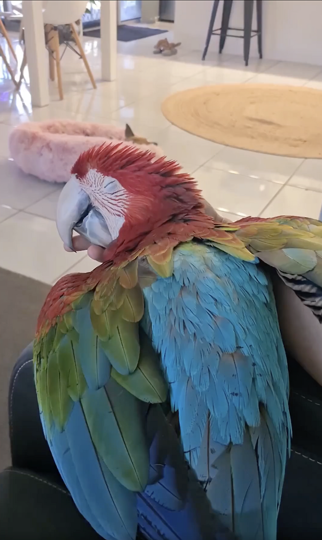 사진 속 앵무새는 알록달록한 깃털을 자랑하며, 주인 곁에서 한껏 신뢰를 표현하고 있었습니다. 특히 주인이 손으로 머리를 부드럽게 쓰다듬어 주자, 앵무새는 눈을 천천히 감으며 기분 좋은 듯 몸을 더 축 늘어뜨렸습니다. 등으로 누워 잠을 자는 모습은 사람의 잠자는 자세와 비슷해 보는 이들에게 웃음을 선사했습니다.