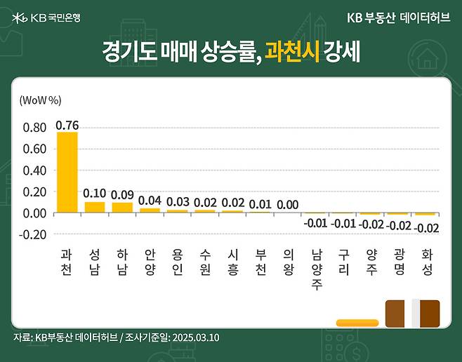 경기 전세가격은 과천시가 상승률 1순위를 기록했습니다. 경기도는 전주 대비** 0.02% 상승 횡보했습니다. 80주째(20개월) 오름세가 유지 중입니다. 상승 1순위는 과천시입니다. 준강남이라는 입지조건이 꾸준한 수요를 유발하고 있는 지역으로 1.06% 오르면서 지난주 2순위에서 1순위를 탈환했습니다. 2순위는 0.19% 오른 의왕시입니다. 봄 이사철 수요와 더불어 과천ㆍ평촌 등 인근 지역에서 유입되는 전세수요가 늘어났습니다. 3순위는 하남시로 서울 접근성을 높이는 교통환경 개선사업의 수혜 단지 중심으로 상승해 0.13% 올랐습니다.