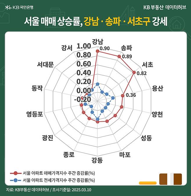 전국 권역별 매매가격은 서울이 0.26% 상승세로 탑 순위입니다. 수도권도 2월부터 회복세를 보이다가 지난주 0.04%에 이어 금주 0.07% 상승했습니다. 서울 상승 강도는 대출 환경 변화로 지난해 11월~올해 1월까지 약했으나, 2월 들어 금리 인하를 염두에 둔 저가매수세가 유입된 것으로 관측됩니다. 서울 상승 1순위는 전통적으로 인기지역이자 토지거래허가구역이 풀린 지역 중심으로 문의가 몰린 강남구이고, 2순위는 꾸준하게 젊은 투자수요 유입이 지속되고 있는 송파구입니다. 3순위는 교육ㆍ교통 인프라조건이 우수한 서초구입니다.