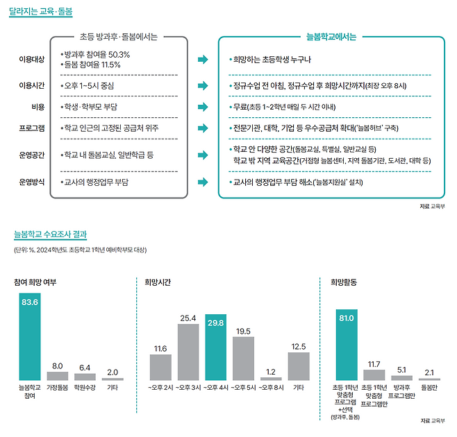 늘봄학교는 부모들의 요구사항을 충실히 반영한 정책입니다. 2023년 교육부 조사에서 선호하는 돌봄 기관을 물어본 결과 ‘학교 돌봄’이 81.4%로 압도적으로 많았습니다. 실제로 2024년 초등학교에 입학하는 학생을 둔 예비학부모를 대상으로 조사해보니 ‘늘봄학교에 참여하겠다’는 응답도 83.6%에 달했습니다. ‘늘봄학교에서 제공할 프로그램들에 다양하게 참여하겠다’는 응답도 압도적으로 나타났습니다.