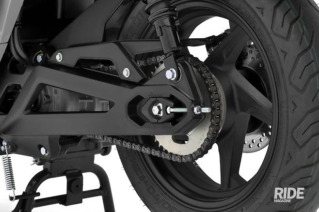 GS100에는 스쿠터치고 상당히 낯선 물건이 장착됐다. 바로 구동용 체인이다. 일반적으로 스쿠터에는 벨트를 이용해 구동이 이뤄지는데, 스로틀을 감으면 바로 최대토크가 쏟아지는 전기모터의 특성 때문에 이쪽을 선택한 것으로 보인다. 디자인적인 면도 그렇고, 이런 구성들도 그렇고 어떤 성능을 보여줄지 점점 더 기대감이 커진다.