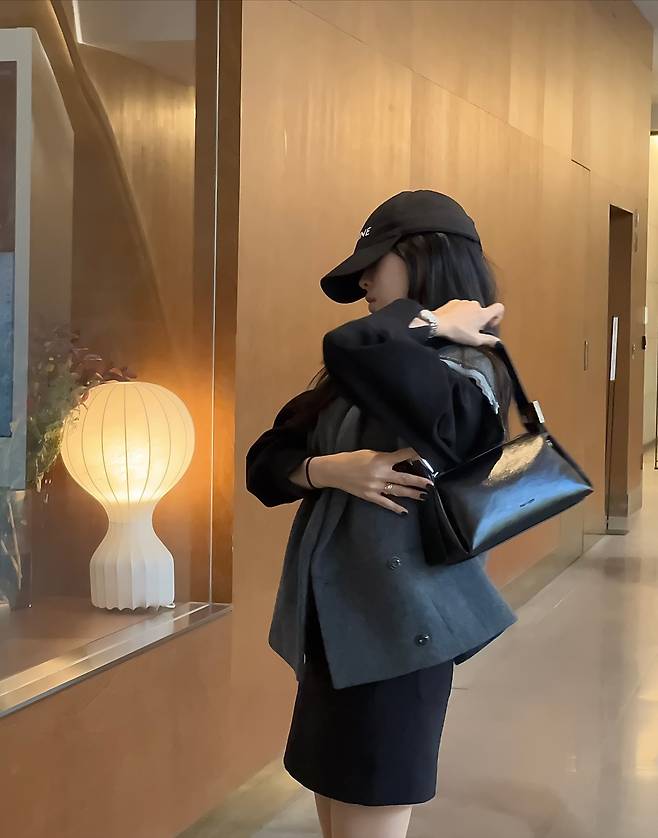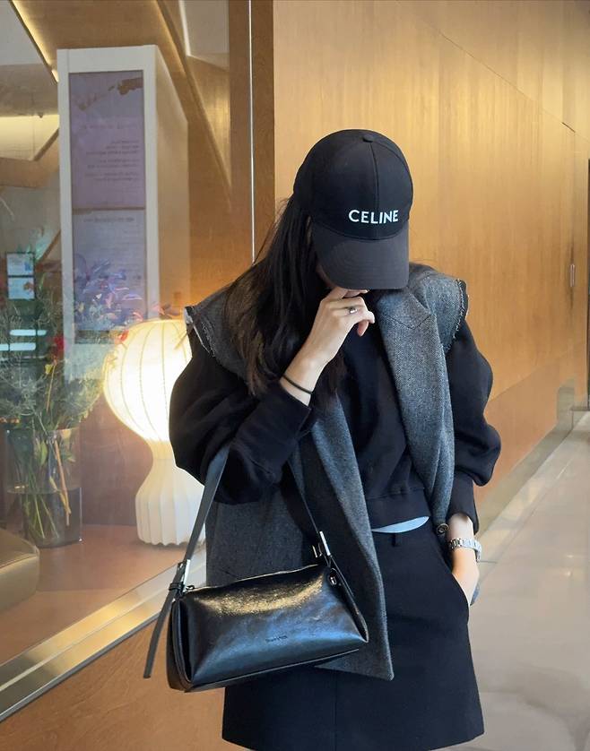 셀린 로고 볼캡과 각 잡힌 블랙 레더백이 더해져 ‘꾸안꾸’가 아닌, 계산된 미니멀룩으로 보여요.