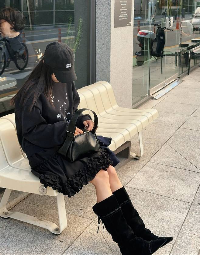 살짝 오버된 맨투맨 위에 러플 디테일의 스커트를 매치해 편안하면서도 확실한 포인트를 주었고, 부드러운 스웨이드 소재의 롱부츠로 실루엣을 길게 정리했죠.
