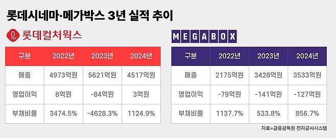 투자가 성사될 경우 양사의 재무 부담은 완화될 가능성이 있다. 메가박스중앙은 2024년 매출 3533억원으로 영업손실은 127억원을 기록했다. 같은 해 당기순손실은 520억원에 달했다. 부채총계는 1조300억원, 자본총계는 1076억원으로 부채비율은 856%이다. 롯데컬처웍스 역시 지난해 매출이 4517억원으로 전년 대비 약 20% 줄었고 영업손익은 83억원 적자에서 3억원 흑자 전환됐다. 대규모 외부 자금 유입 없이는 재무 구조 개선이 쉽지 않다는 평가가 나온다.