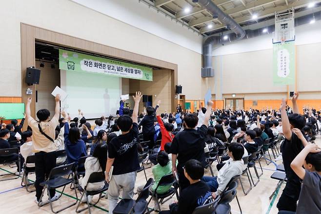 특히, 이번 캠페인은 유명 과학 커뮤니케이터 ‘궤도’와 과학 콘텐츠 크리에이터 ‘긱블’이 각각 일일 강사로 함께 하며 학생들이 재미있게 올바른 디지털 활용법을 배우고 창의력과 호기심을 자극할 수 있도록 진행되었다. 강연 이후에는 학생들이 ‘스마트폰 사용 다짐서’를 직접 작성하며, 함께 논의하는 시간을 통해 배운 내용을 되새기고, 디지털 기기 사용에 대한 자율적 실천을 다짐하는 시간을 가졌다.